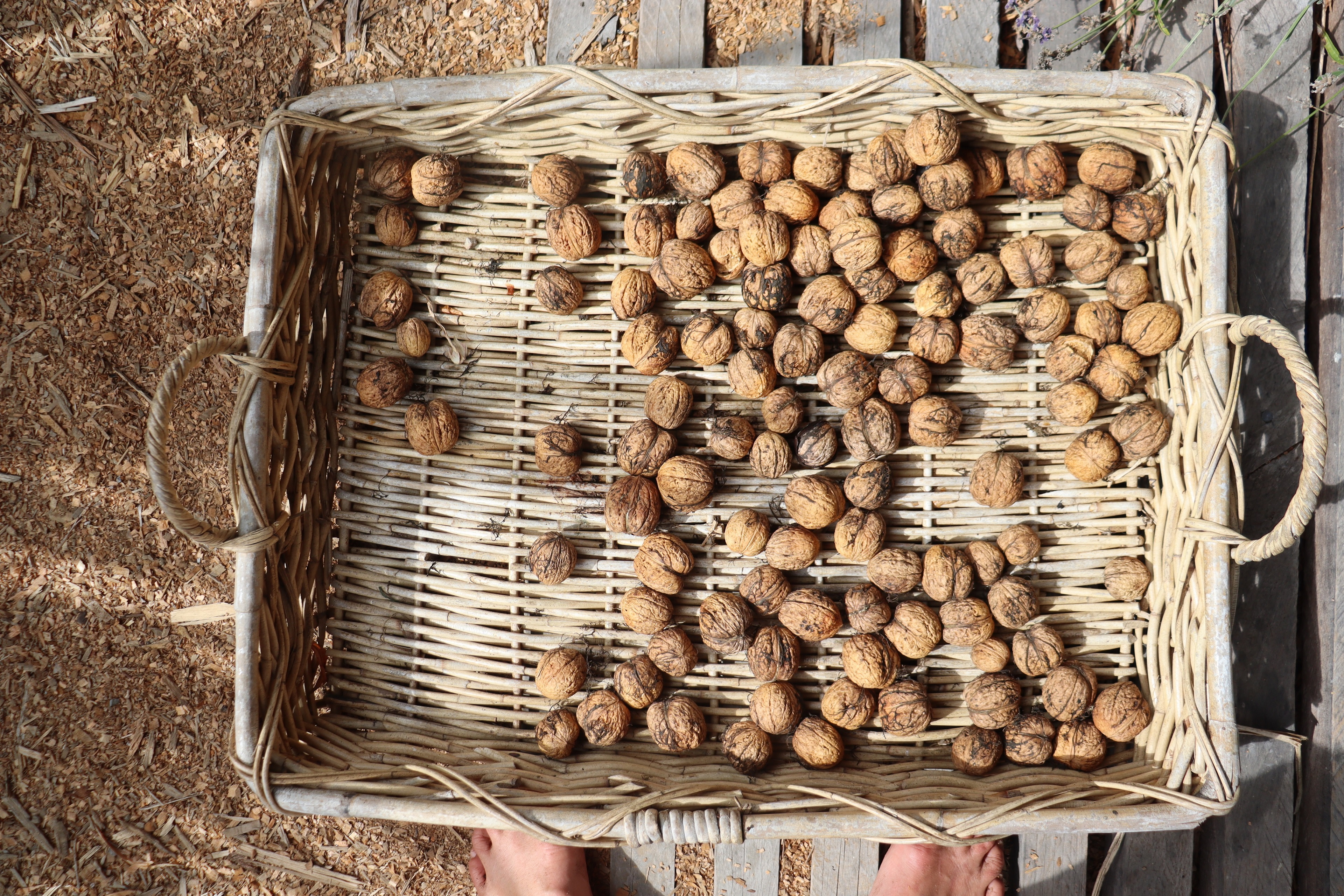 Gather up walnuts and hazelnuts as they fall. Dry them in single layers in baskets or racks before storing away in onion bags in a dry rodent free place. Such a good value food crop!