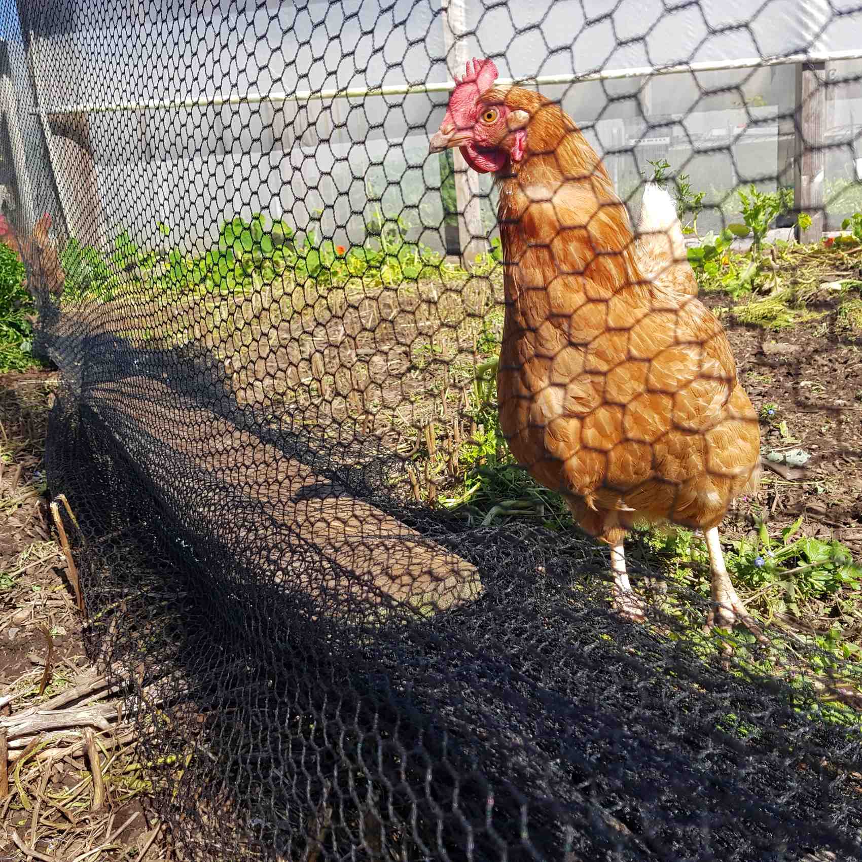 I use a mixture of permanent wire fences (the same ones that surround my berrycage and chook housing) + mobile birdnets ( the big nets I use to bird protect my fruit trees in summer). These I peg them to 1.8m high overhead wires - a grid of wires above the vegie patch enables me to enclose a variety of spaces. Planks laid on the bottom stop escape. It's essential the bottom is solidly in place. This is fast and easy to move around, my best chook system yet!
