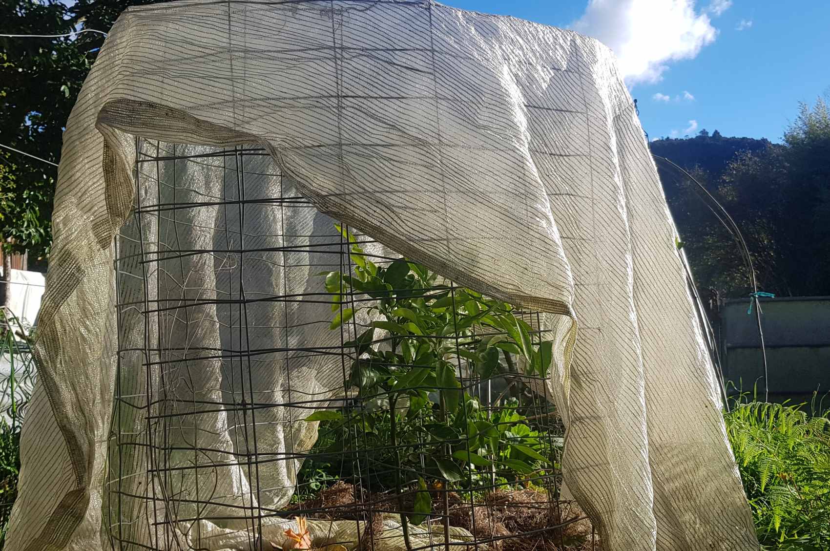 Here we've put a simple ring of leftover deer netting around a young lemon and laid the frost cloth over top. The structure is important because it stops the cloth wrecking the foliage/ branches. Get creative and use what you've got! Here's another idea for a simple frost shelter.
